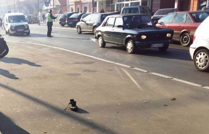 Pešak je ostao da leži na ulici pored lokve krvi, a od siline udarca patika nesrećnog čoveka je završila nekoliko metra dalje.