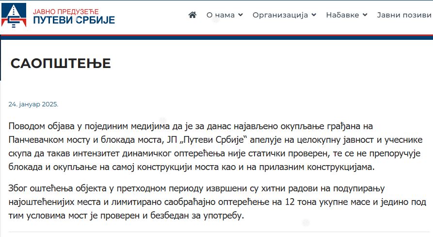 Prošlog petka 24. januara 2025. godine povodom najavljene blokade Pančevačkog mosta u znak podrške studentima, istog dana oglasilo se državno preduzeće JP Putevi Srbije o bezbednosti na samom mostu.