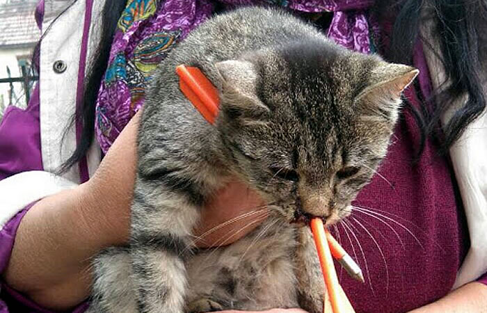U petak, 3. novembra, ujutru oko 10 časova naš sugrađanin Bojan iz Borče zatekao je mače koje je neko na monstruozan način pogodio sa samostrelom i to sa dve strele.