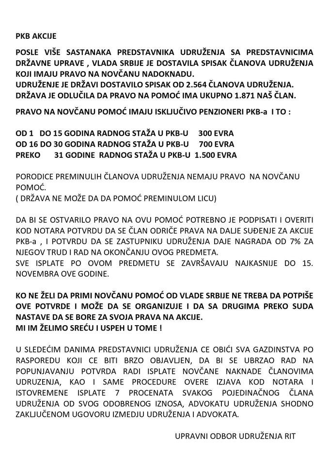 Kako se u saopštenju navodi, postignut je dogovor da država isplati „pomoć“ članovima ovog udruženja, u skladu sa godinama koje su proveli radeći u PKB-u.