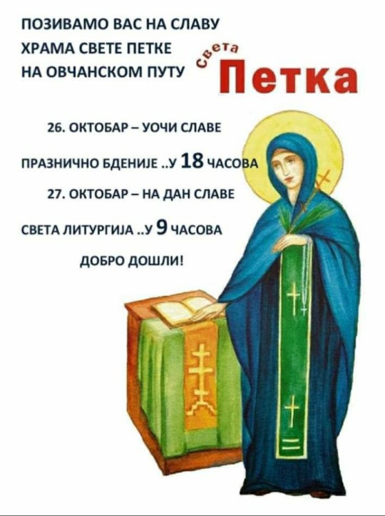 Pravoslavni vernici i Srpska Pravoslavna Crkva, sutra obeležavaju Svetu Petku, koja je inače i slava Hrama Svete Petke na Ovčanskom putu.
